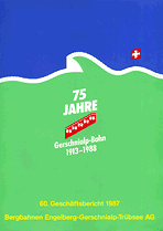 BEGT 75 Jahre Gerschnialp-Bahn 1913-1988 60. Geschäftsbericht 1987 Bergbahnen Engelberg-Gerschnialp-Trübsee AG Innentitel: Jubiläumsschrift 75 Jahre Drahtseilbahn Engelberg-Gerschnialp 60 Jahre Luftseilbahn Gerschnialp-Trübsee 40 Seiten, 31 Abbildungen s/w, 21 x 29,7 cm Broschüre (geheftet) herausgegeben von den |