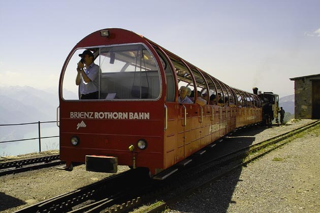 Ankunft eines Dampfzuges in der Station Rothorn Kulm am 28. Juli 2005.