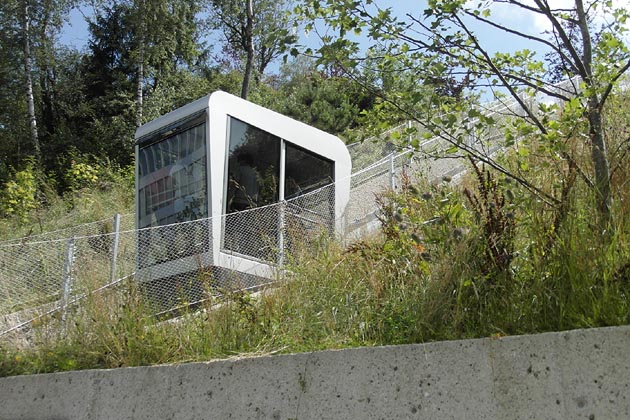 Funicular from 'The Circle' up to the Butzenbüel hill on July 18, 2021.