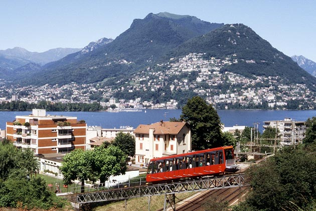Lugano-Paradiso: bridge across the SFR station with Mount Brè in the background on July 4, 2002.