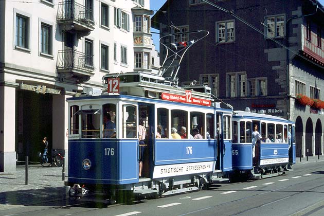 The no. 176 motorcar and no. 455 trailer are passing the Limmatquai on August 9, 1997.