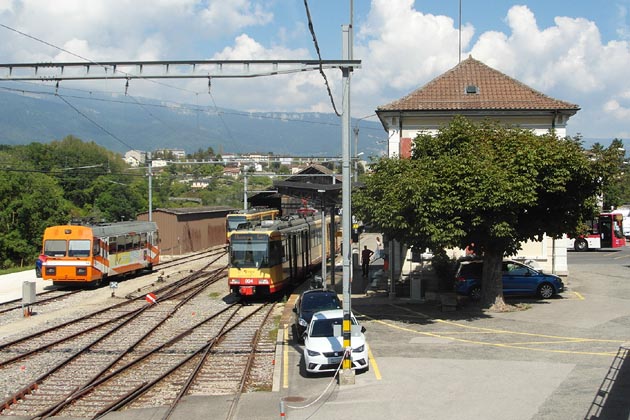 Neuer Triebwagen 004 (ex AVG Karlsruhe ex DB Baureihe 450) in Orbe am 29. August 2022; links der Triebwagen 14.