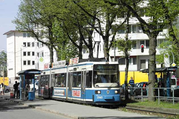 Tramway line no. 18 with motorcar no. 2163 at the Lautensackstraße stop on April 30, 2012.