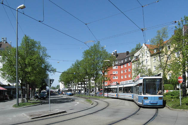 Tramway line no. 19 with motorcar no. 2140 near the Lautensackstraße stop on April 30, 2012.